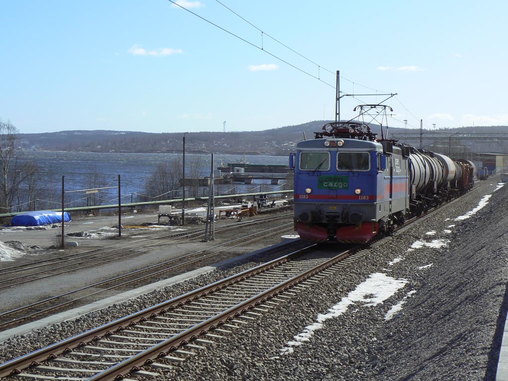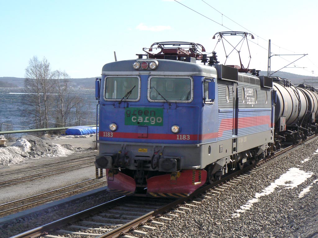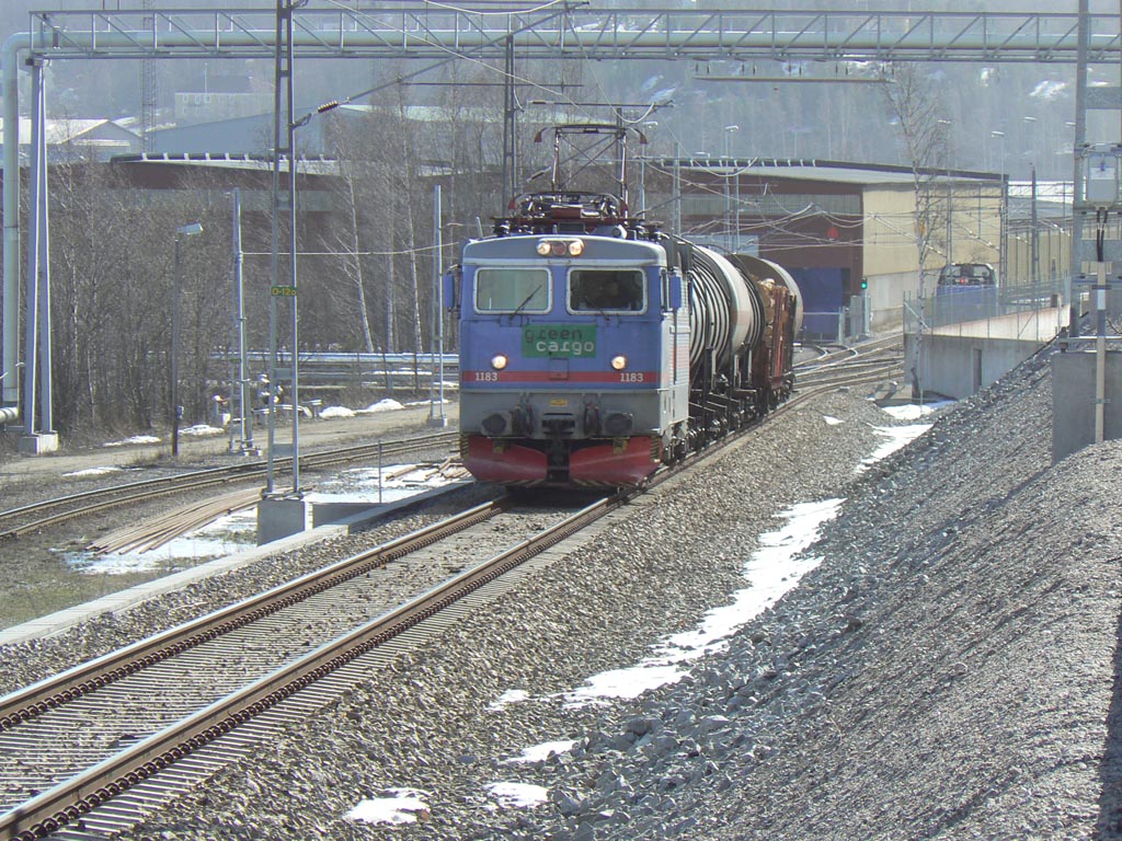 Här kommer godståg draget av Rc4 1183, tågnummret