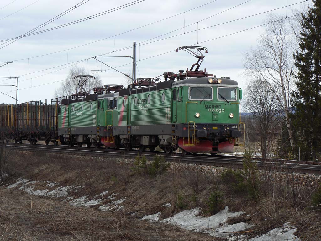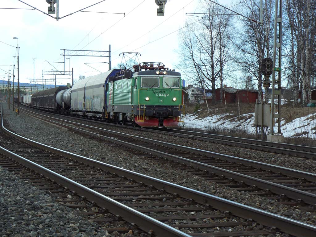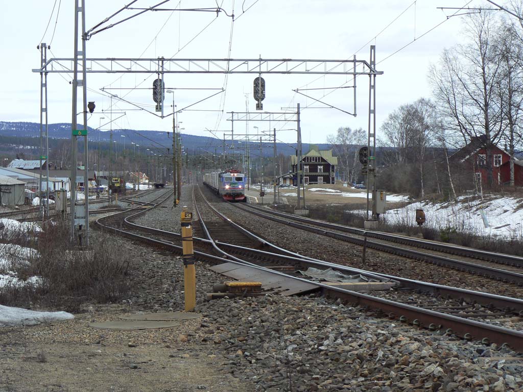 Godståg draget av Rc4 1267 passerar Mellansel. |