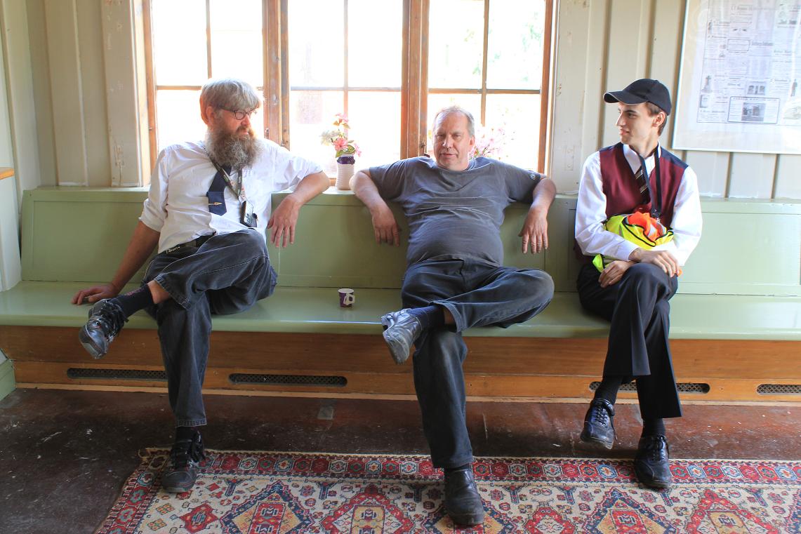 Pelle Björkman, Bengt Sundin och Mikael Olofsson sitter och "ljuger" på stationsbänken. |