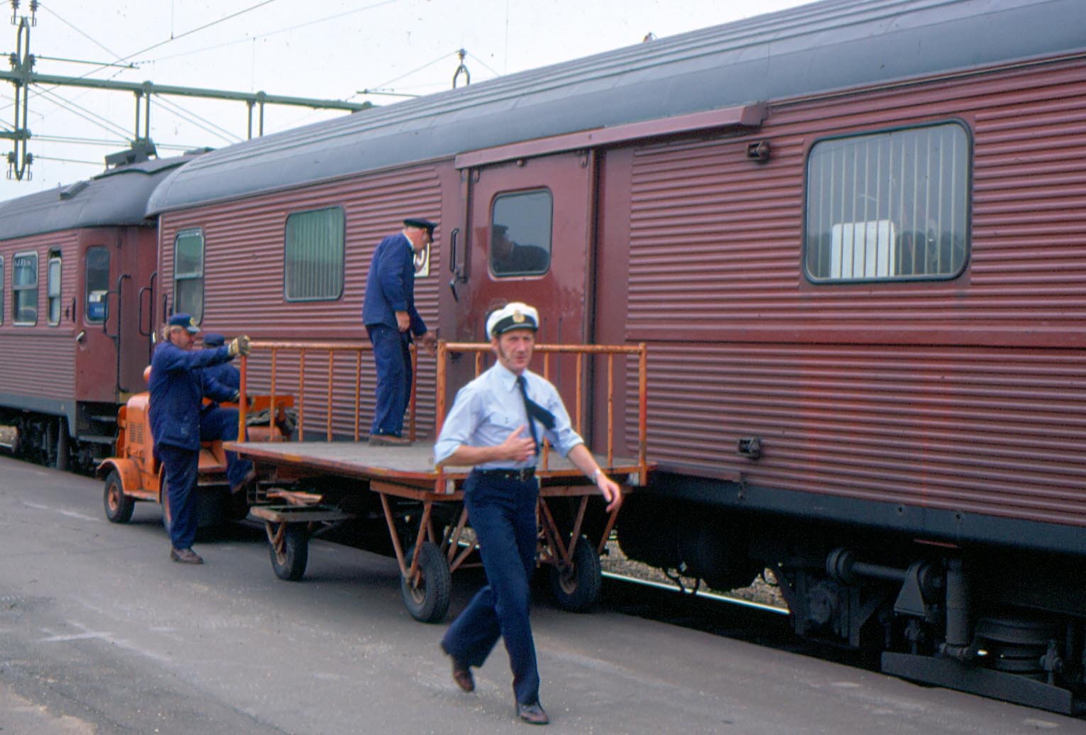 Lossning av resgods sedan vidare med perrongtruck. |