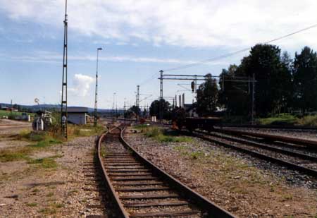upp framför stationshus och godsmagasin. I mitten huvudspåret, till höger spår 4 - 5 samt spår 6 (den del som är kvar) som leder till industrispår och lokstall. |